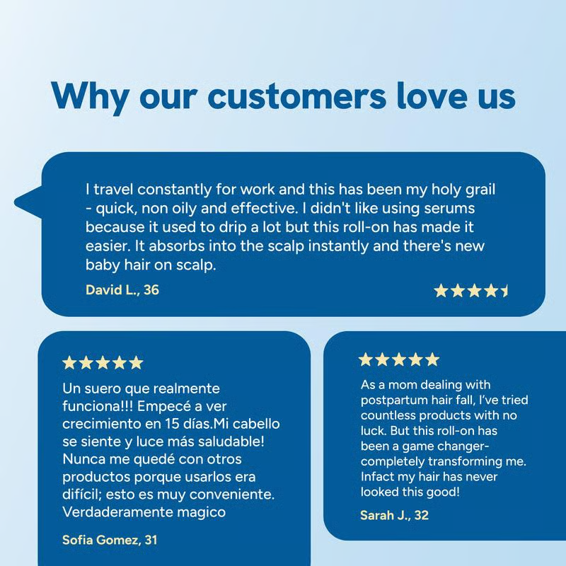 Universal & Easy to Use – Works on all hair types as a stand-alone scalp serum, a hair growth oil spray substitute or alongside hair vitamins/supplements; simply massage the roller for 2 min twice daily.