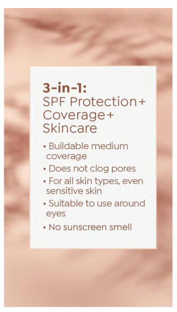 - A formula of sunscreen, light-protecting pigments and skin-loving ingredients for temporarily, healthy-looking skin