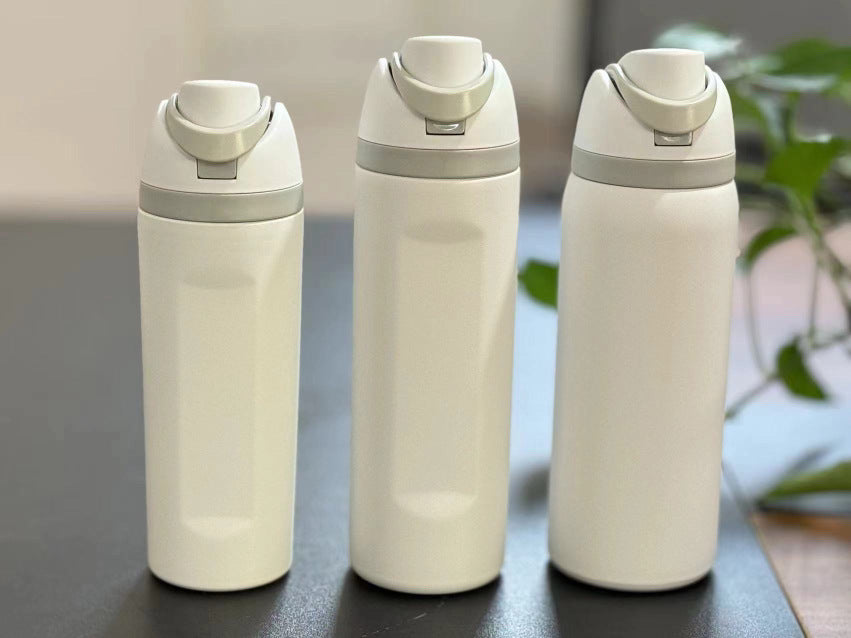 - 24-ounce insulated stainless-steel water bottle with a FreeSip spout and push-button lid with lock