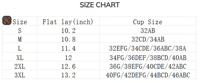 Cup sizes: A, B, C, D, DD (E), DDD (F)