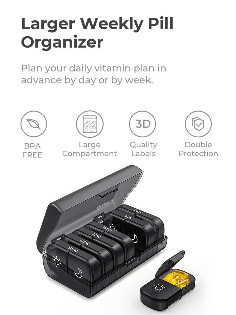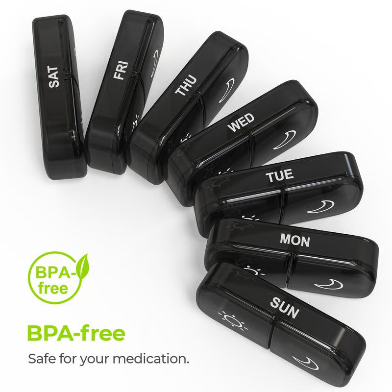 Each daily pill box fits easily into your wallet or pocket, making it perfect for travel. The black case not only protects your privacy but also securely holds a week’s worth of pills. Take your health with you wherever you go! 🌍