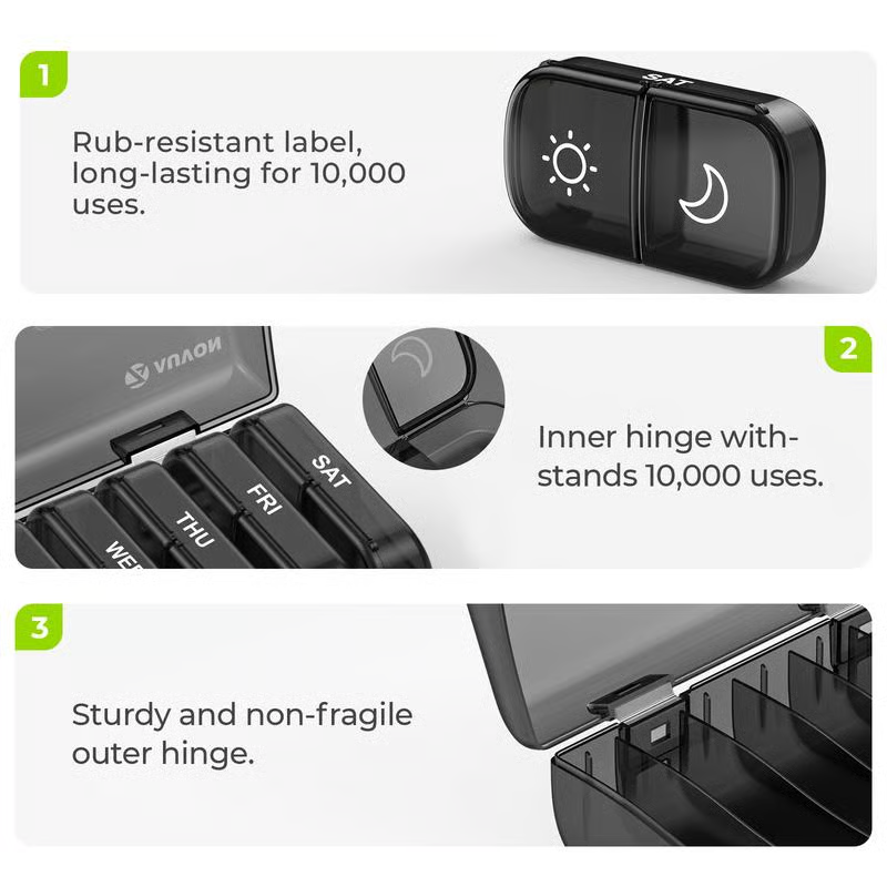 Built to last, the AUVON pill organizer boasts a reinforced shell and inner hinges that can withstand up to 10,000 uses. The UV-printed labels ensure long-lasting visibility, so you never have to worry about faded markings. 🌈