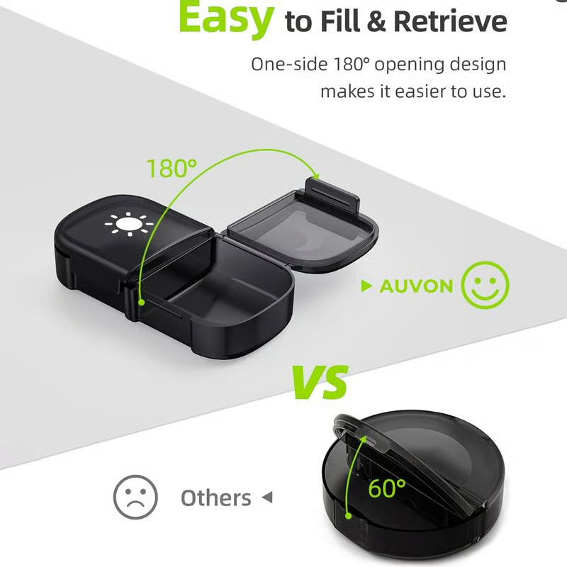 The innovative design features all lids opening on the same side and staying open at 180°, making it effortless to fill and access your pills. Say goodbye to struggling with small, awkward containers! 🙌
