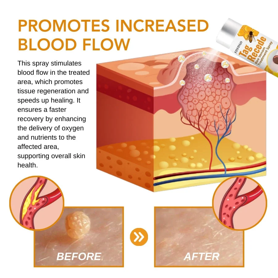 Fivfivgo™ TagRecede Bee Venom Treatment Spray works by harnessing the potent bioactive compounds found in bee venom, such as melittin, apamin, and adolapin, along with enzymes like phospholipase A2. These ingredients penetrate the skin to target and break down the abnormal tissue of skin tags or warts. Additionally, the spray stimulates blood circulation in the treated area, promoting tissue regeneration and accelerating the healing process. Its antiviral properties further aid in preventing infections, making it an effective and holistic solution for skin tag and wart removal.